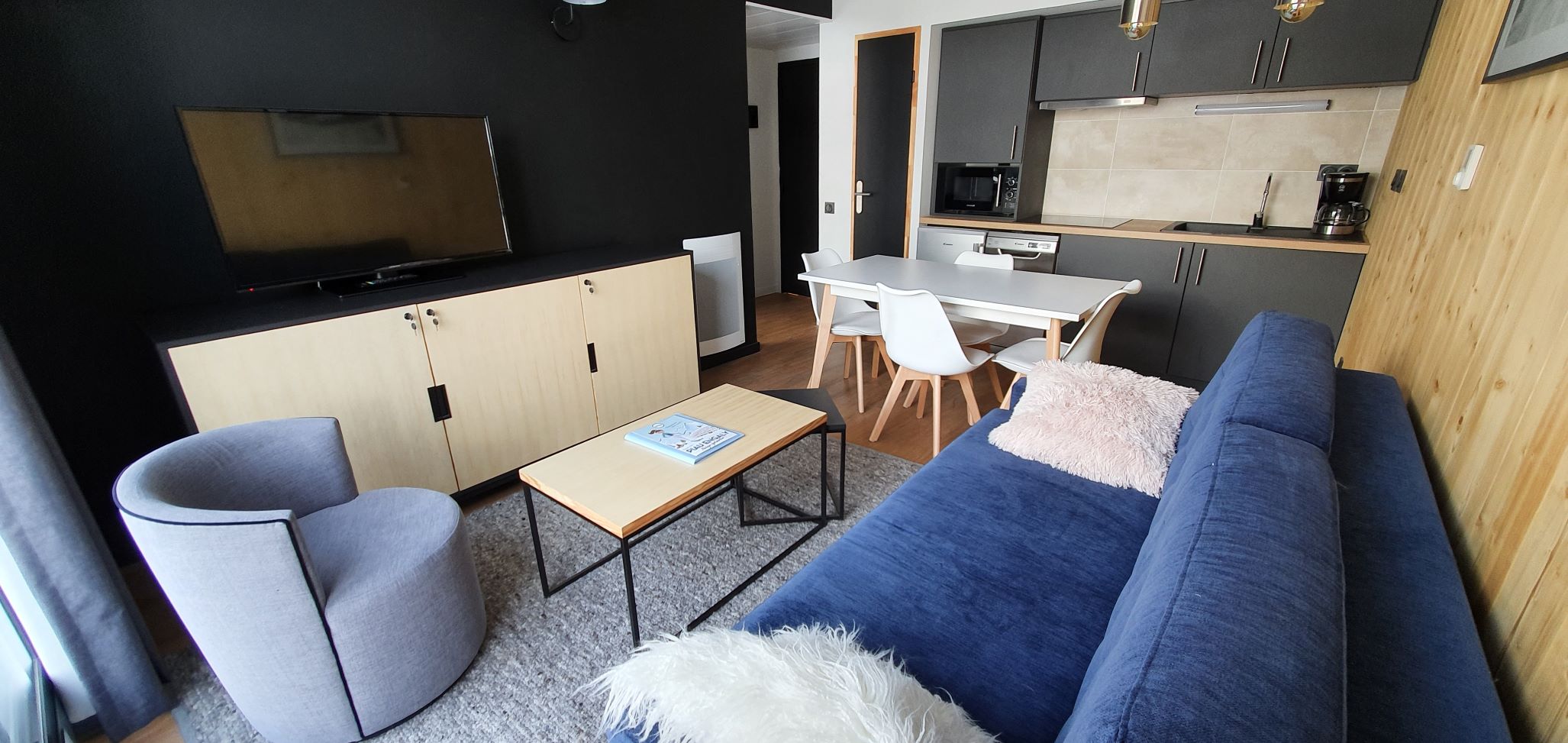 Séjour convivial : Un espace séjour équipé d’un clic-clac (140 x 190) vous attend, ainsi qu’un coin cuisine moderne avec lave-vaisselle et four micro-ondes pour des repas gourmands après une journée de randonnée.