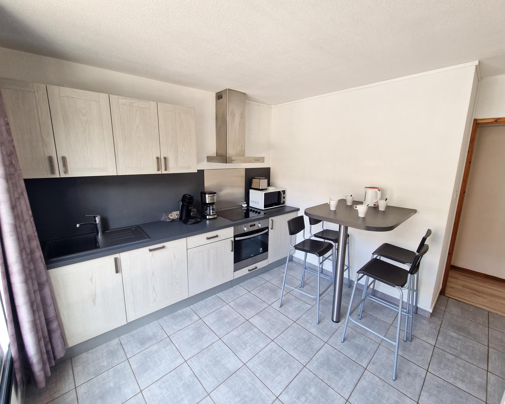 Vous apprécierez la cuisine indépendante entièrement équipée : lave-vaisselle, four, micro-ondes, réfrigérateur, et un coin déjeuner convivial pour commencer vos journées en beauté.