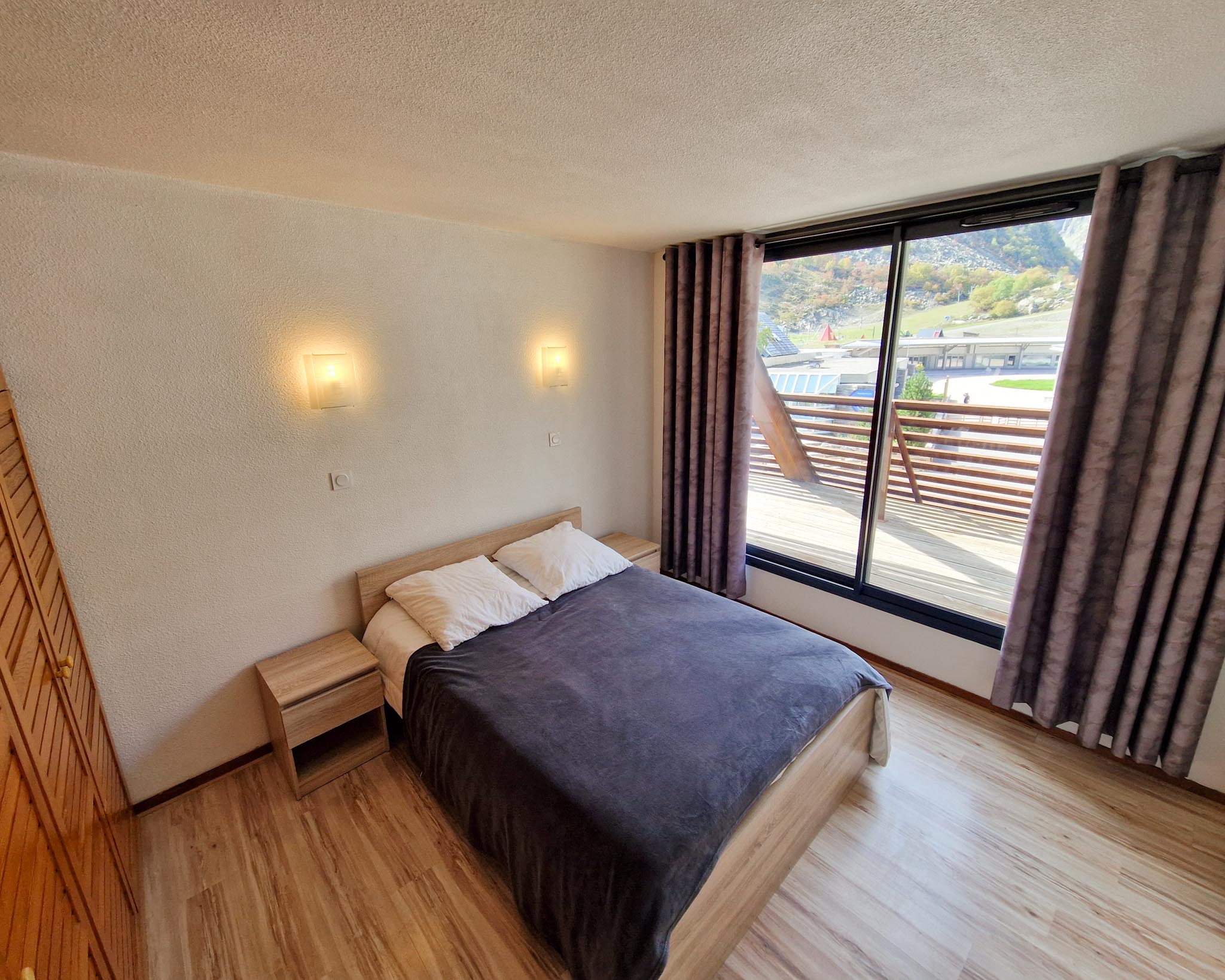 La chambre, dotée d’un grand lit (140), bénéficie d’une agréable exposition ouest avec vue sur la station et d’un accès direct au balcon pour profiter de l’air frais et du panorama.