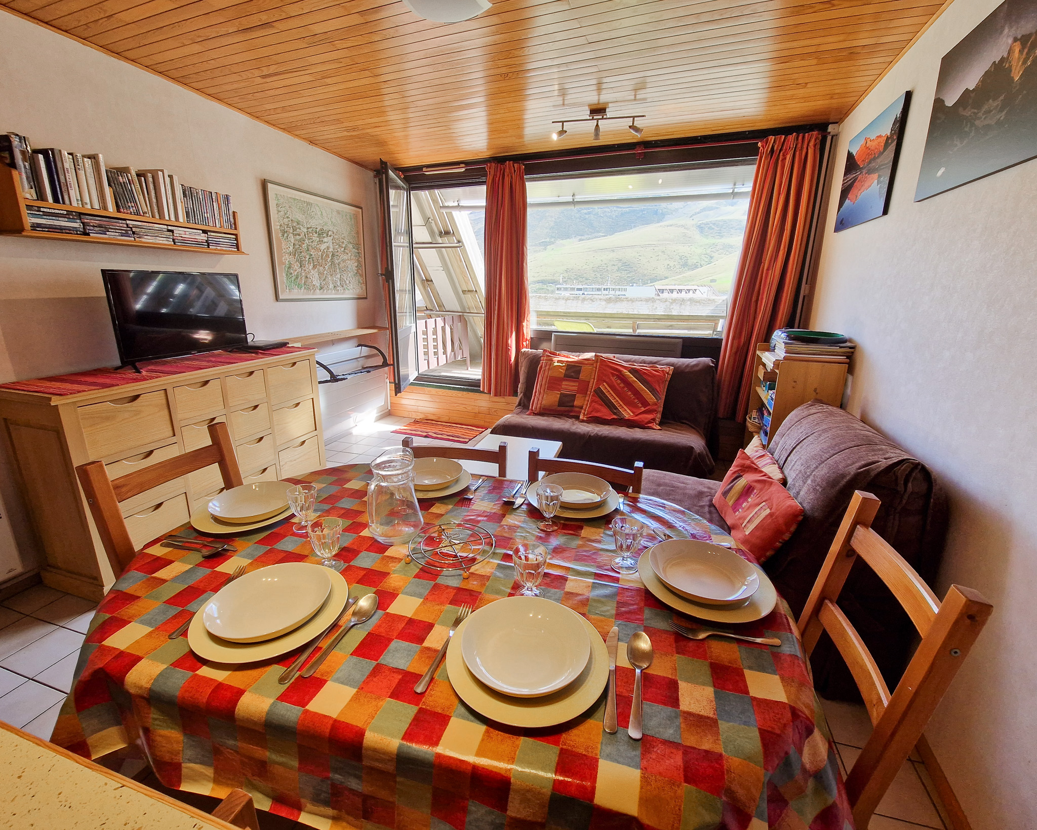 A seulement 100 m des pistes et remontées mécaniques, offrant une vue panoramique sur les pistes et la vallée, ce 2 pièces de 7 couchages conjugue confort et praticité.